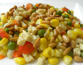 天贝、彩椒、甜玉米、豌豆分别焯熟,松仁炸熟,备用。