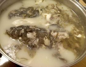煎过鱼头放入没过鱼的水,等水开放黄酒,烧20分钟左右后放入豆腐,再煮5分钟,就完成(再放了点咸菜炒冬笋)