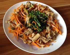 牛肉切丝,用水淀粉、料酒黑胡椒粉抓一下,备用。胡萝卜切丝,平菇香菜洗净备用。姜切末,葱切成葱丝。