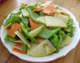 - 8. 翻炒均匀,将土豆片,胡萝卜片,尖椒炒熟,最后加入味精调味。
