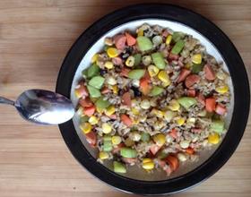 1。各类菜切丁时不要切太碎,碎了口感不好,香菇太碎也容易糊。2。少油版炒饭秘诀在于可以先炒胡萝卜和香菇,翻炒一会儿加一点水,用热气将蔬菜蒸熟,随后再加入其他材料。3。玉米粒是从煮熟的玉米上剥下来的,罐头型的偏甜,冷冻的不新鲜,有时间的话可以提前煮一锅玉米,看电视的时候提前剥好,放冰箱备用。3。玉米粒置换成鸡蛋也可以,也是五彩的哦。