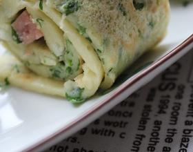 两种煎饼重叠在一起,放上切好条状的午餐肉,迅速卷起,然后对半切,在煎饼卷上放上一片芹菜叶和一粒午餐肉,再用牙签固定住即可