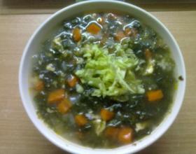 蒜蓉、洋葱、红萝卜粒依次放入锅中翻炒后放水烧开,洋葱最好是变透明了,萝卜可以是根据个人喜欢的熟度,然后放入紫菜烧开后打入鸡蛋,稍微弄散蛋黄。