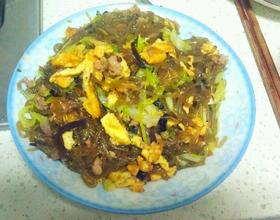 - 6. 大概炒到水份稍微收干,粉丝变色,加入蛋丝拌炒均匀,即可起锅。