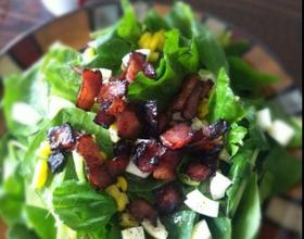 菠菜洗净,用冰水浸泡片刻,撕成一口大小,黄瓜刨皮切片,蛋白切碎,玉米煮熟切下玉米粒放凉,培根小火煎脆放凉备用。
