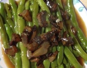 将腊肉的油逼出来,再放四季豆翻炒,加入蚝油、幼糖、盐、水即可。