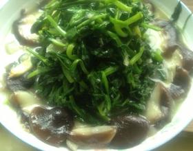 将焯过水的豌豆尖和香菇倒入锅中加入高汤大火翻炒