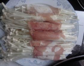金针菇洗净,把羊肉卷趁它还是冷冻的时候,把适量的金针菇,放进去。不然一会羊肉卷就消冻变成一片了。
