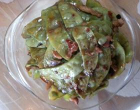 扁豆上下去筋,洗净,锅里放底油,花椒,干辣椒,一勺豆瓣酱爆香,扁豆下锅翻炒一会儿,加糖,老抽,水,稍微炖煮一会儿,出锅放点蒜沫即可,非常下饭!