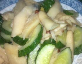 水煮笋和黄瓜洗净切片。油热后麻椒爆下锅倒入笋,黄瓜翻炒,再放入醋,盐翻炒几下。出锅前放味精。脆香,酸爽。
