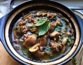 - 5. 待鸡翅变色变熟时放入蘑菇、洋葱、少量切碎的小辣椒翻炒。