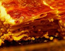 - 4. 烤盘底层铺层肉酱,盖上干千层面皮,撒点CHEESE,然后再肉酱、CHEESE、面皮重复铺几层,最后一层铺肉酱,撒上厚厚一层CHEESE。烤箱200度30分钟,中途观察CHEESE烤黄脆了加锡纸以免烤焦。。