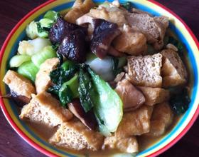 加入切好的香菇和油豆腐,放入蚝油和生抽,翻炒片刻,倒入高汤。