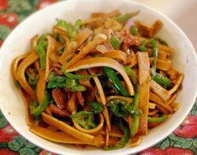 可以用新鲜肉丝代替香肠。肉丝用生抽,料酒,淀粉拌匀腌制一会儿。肉丝煸炒至发白后捞起,等辣椒丝香干丝炒好后再倒入拌炒均匀。因为用生抽拌过肉丝,所以后面的用盐量要减少一点。