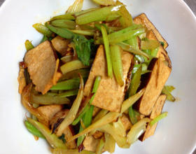 锅内放少许底油炒香葱姜,下如熏干炒出香味后迅速下入芹菜翻炒。依次下入生抽,老抽,盐,味精调味即可。