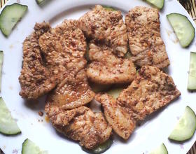 把茶叶用开水冲开放凉,把五花肉放入茶水中浸泡4个小时。然后拿出来放入盐孜然粉辣椒粉(喜欢辣椒粉的可以多放)花椒粉。