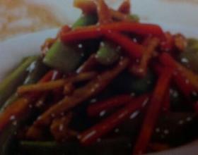 锅留余油烧热,放入四季豆、胡萝卜丝中火炒匀,加1汤匙水焖煮至熟,再加入炒好的牛肉丝拌匀,淋上香油即可。