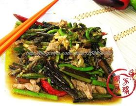 锅内放油烧热,爆香蒜蓉,倒入瘦肉丝炒至散开,等肉色变白将蕨菜倒下锅,与肉丝一起煸炒,撒入盐调味