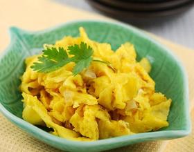 放入鸡蛋液,衬蛋液还没有凝固的状态下,用铲子顺时针和逆时针交错滑散。就可以炒出细碎的鸡蛋啦。(小妙招)