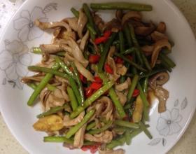 再放入蒜苗,炸炒至蒜苗软香(根据自己口味定,我喜欢蒜苗炸软),加入少许盐