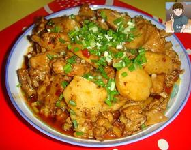 锅中放油烧热,倒入配料爆炒(小葱除外)~在将鸡块儿倒入一起炒,放酱油上色,吃得麻辣的可以在多放些花椒和辣椒,加芋头加水。