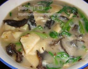 - 6. 锅底留少许油,放入少许面粉炒面,加入水,熬成白汤,这样的汤才会滑顺,锅开后放入泡好的木耳,有黄花菜的话泡些放入更好,我家没有,我没放。