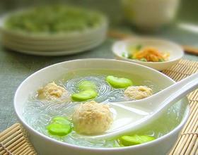 - 3. 锅中加入适量清水,大火烧开,将蚕豆瓣放入煮5分钟,之后将火调小些,让锅中的水保持微沸,然后洗净双手,不用擦干,让双手保持湿润,左手握住一些拌好的肉馅,稍许用力,从虎口处挤出一个肉圆,用汤匙舀入到锅中,依此方法,将拌好的肉馅全部制成肉馅