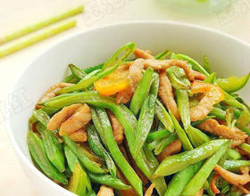 猪里脊清洗干净,顺着肉的纹理切成丝,扁豆去掉老筋,斜着切成丝。姜切丝,青椒洗净切成细丝,蒜切薄片备用。