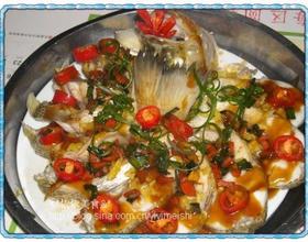 鱼身部位切成腹部相连的块状,放上鱼头、鱼尾摆盘: