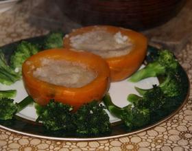 取两只鸡蛋的蛋清,和银耳芋头苹果茸混匀后,填入南瓜中,隔水蒸十五分钟。