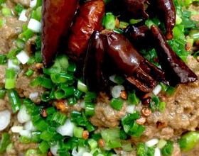出锅时把小葱撒在麻豆腐上,另起一锅把油烧热,将干辣椒炸出糊香味后淋在小葱上即可。