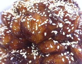 等到每个汤圆都充分裹上糖,并且外层已经起了一层脆脆的东西就可以起锅了。(多的油不要,)再撒上一层芝麻。