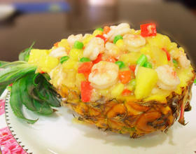 - 4. 锅烧热倒入油,煸香葱姜蒜末,倒入虾仁煸炒至变色,加入青豆、胡萝卜丁、菠萝块一起翻炒,放少许盐、白糖、料酒、鸡精调味,水淀粉勾玻璃芡,淋入几滴香油;起锅装在菠萝盅里。