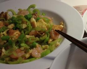 同样的锅放入虾仁青椒丝翻炒,水收干之后倒入刚才的鸡蛋。放生抽起锅