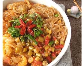 - 11. 依次放入东北酸菜丝、酸豆角、烫软的油面筋和里面的水,稍煮,再放入地瓜粉丝煮软至菜分别入味停火;