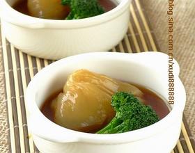 - 5. 西兰花掰成小朵,用淡盐水浸泡半小时捞出洗净,入开水锅中,加适量油和盐焯熟,配在花胶边上即可。