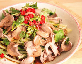 - 4. 腰片码在黄瓜丝上,加入酱油,醋,糖,花椒油和一点蒜蓉,放上香菜叶子和红辣椒片,齐活