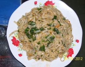 将面条放在大碗里,同时放盐,油泼辣椒面,韭菜,醋,搅拌均匀,即可食用