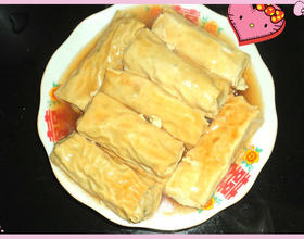 - 5. 锅里放水先蒸5分钟左右,锅里放入少量的油将千张包用筷子一个一个小心放进锅子,加入少量的水,盐,味精,煮一小会儿,用玉米淀粉勾芡一下,用筷子一个个先夹出来然后再倒上汤汁,这样可以保持外形。