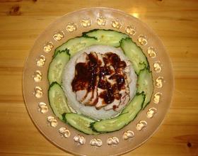 本来是想买把菜心来配的,没想到市场那里正上演全武行。两个小贩因为抢摊位在打架,我怕被踩了脚,赶紧走开了,只好拿当水果吃的黄瓜来糊弄自己了,没想到脆脆的黄瓜蘸照烧汁还是很爽口的。