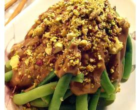 把调好的麻汁浇到入盘的长豆角上,再洒上开心果碎即可。