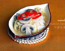 葱姜蒜末炝锅,倒入白菜翻炒至六成熟,放入焯好的口蘑,加盐