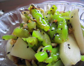 - 5. 锅中加一点花生油烧热,放入辣椒爆香,加入大蒜、盐、芝麻、蜂蜜、酱油熬成汁,出锅前加几滴芝麻油