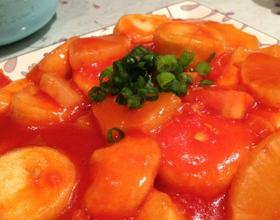 - 4. 另起油锅,下番茄酱炒一会,兑少许水,加糖盐酱油,在下番茄丁和菠萝一块翻炒至汤汁浓稠。再兑一点刚才豆腐的淀粉水。