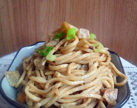 - 12. 然后倒入面团,浇上麻酱,葱花,榨菜即可。