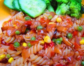 肉酱DIY~锅中放入橄榄油,爆香洋葱,再放入肉糜炒制,变色之后放入西红柿、依次放入焯好水的豌豆、玉米、胡萝卜,继续翻炒吧,继续放入番茄酱,继续翻炒两三分钟,再放盐调味~其他的没加,酸酸甜甜的最有爱了~西餐厅的肉酱里有放奶油还是什么,不好那口所以没加,你要喜欢也可以放一点进去~