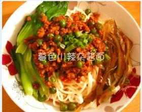 - 4. 净锅清水烧开,下面条大火煮开,转至中火煮3分钟捞起,沥水盛盘。烫熟鸡毛菜,将海带丝和鸡毛菜摆在面条上边,浇上熬好的杂酱,拌匀即食。【可搭配任意清汤】