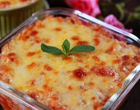 再将马苏里拉奶酪丝均匀的撒在酱汁上,烤箱220度,中层,上下火,烤制约10分钟左右(观察奶酪表面金黄即可);