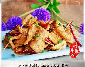 罗里吧嗦:1.肉片尽量切的大小一致,这样炸制的时候成熟的时间会比较一致2.用啤酒配合淀粉腌制肉片,可以使肉片更嫩滑3.肉片串成波浪形比串成平片造型更好看4.心蓝自制的烤肉酱、生抽本身有咸味,不再需要盐来调味5.心蓝自制的烤肉粉,赋予了这道菜诱人的奇香6.牙签用开水浸泡,一可消毒,二可避免炸制时焦糊
