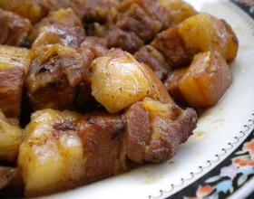 捞出肉放进炒锅将高压锅内的汤大油撇干净倒进炒锅刚刚沉过肉然后放入葱姜八角桂皮酱油醋料酒炖7.8分钟